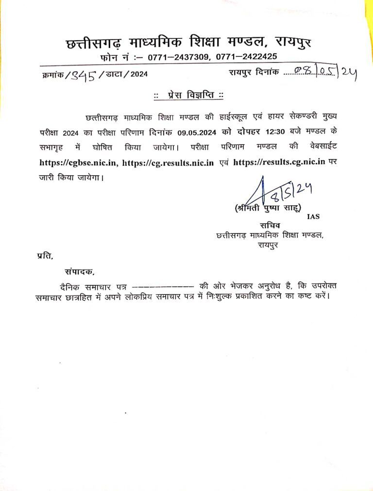 माध्यमिक शिक्षा मंडल रायपुर के सभागार में होगी रिजल्ट की घोषणा जिसे आप माध्यमिक शिक्षा मंडल के वेबसाइट में जाकर देख सकते हैं इसके माध्यमिक शिक्षा मंडल ने तीन लिंक दिए हैं जहां पर आप अपना परिणाम देख सकते हैं